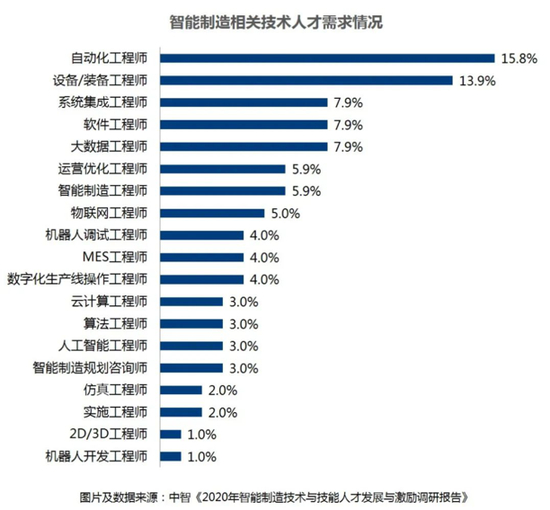 从企业招聘智能制造相关技术人才的需求来看,需求量前五位依次是自动化类工程师、设备/装备工程师、系统集成工程师、软件工程师以及大数据工程师,智能制造技术人才的需求更多地集中在电气与自动化、互联网、人工智能等新兴技术产业。