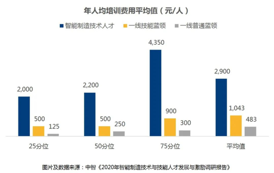 培训成本方面,2020年一线普通蓝领人均培训费用平均值为483元/年,人均培训时间为23小时/年;2020年一线技能员工人均培训费用为1043元/年,人均培训时间为33小时/年;2020年智能制造技术人才人均培训费用为2900元/年,高位值可达4350元,人均培训时间36小时/年。
