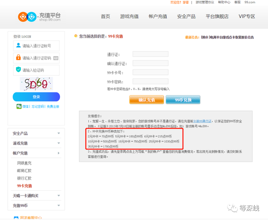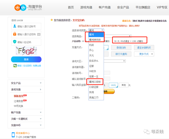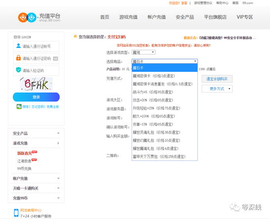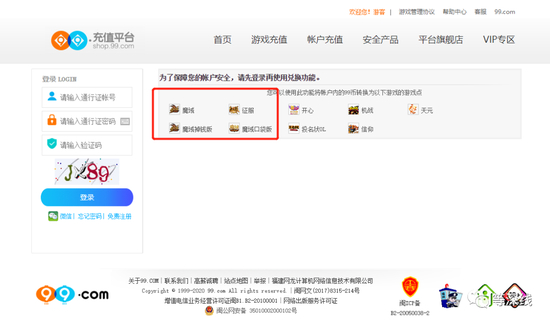 网龙旗下的99充值平台shop.99.com显示,虚拟货币“通宝”可以用来充值的游戏产品列表中,并没有西山居世游运营的《魔域》正版手游。“99币”可以通行使用的游戏产品中,也并不包含《魔域》正版手游。