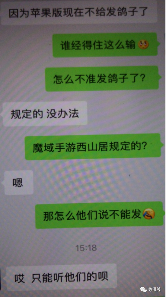该玩家还向记者称,据他与《魔域》正版手游包苹果区的大商人的微信聊天记录,如果其也想成为商人,对方声称可将自己的拿货渠道以3万元价格卖给该玩家,并表示“我给你的渠道,他(渠道方)会帮你解决所有的问题”。