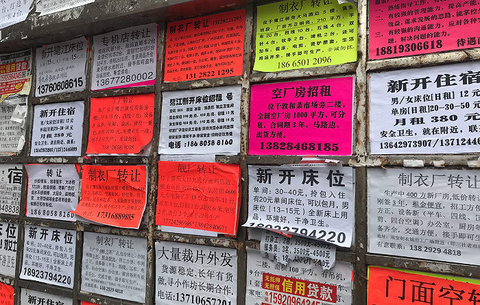 村内随处可见“制衣厂转让”的广告。(图片拍摄:吴容)