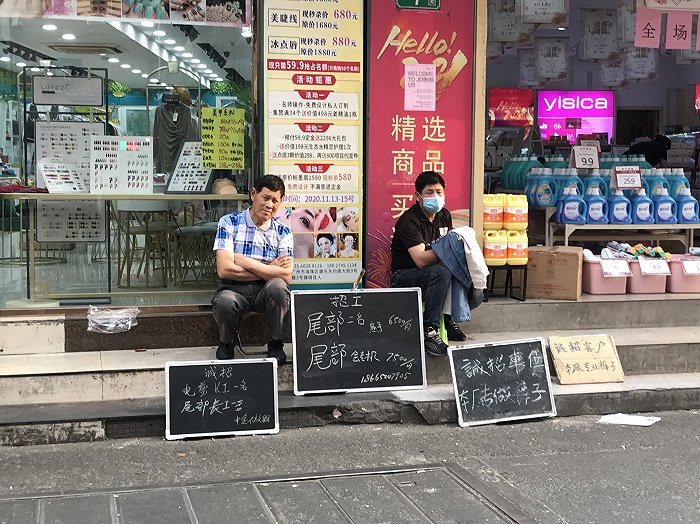 横七竖八的电线裸露在密布的握手楼之间,窄巷子里人流涌动,随处可见举着牌子招工、找客户的制衣厂老板,也有挑挑拣拣、谈不妥薪资的务工人员。每隔几分钟,拉货的电动车和货车急切地按着喇叭,想要穿过拥挤的人流,喧嚣声交杂在一起。
