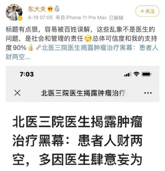 北京大学肿瘤医院消化道肿瘤内科主任医师张晓东转发媒体报道后评论称:“标题有点狠,容易被百姓误解,这些乱象不是医生的问题,是社会和管理的责任,总体可信度和我的支持度90%。”