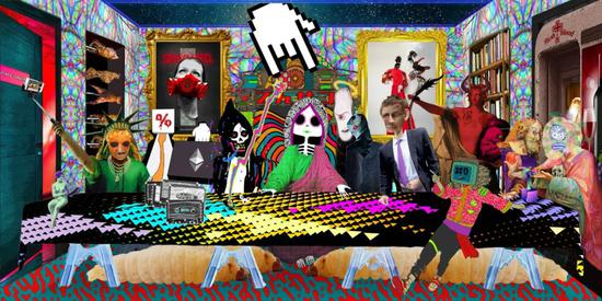 展览上,Beeple《日常》中的几帧也在展示屏幕上往复循环,但在这个更丰富的游戏场里,它明显没什么吸引力。另外一件里程碑式的作品《第一顿晚餐》更为抢眼,电子屏悬挂在展厅高处,属于可编程艺术(Async Art),即作品通过区块链上的加密可以进行实时变化。作品中,每一个人物都是一个NFT,都可以进行交易,每当链上出现了新的交易,人物就会发生变化。