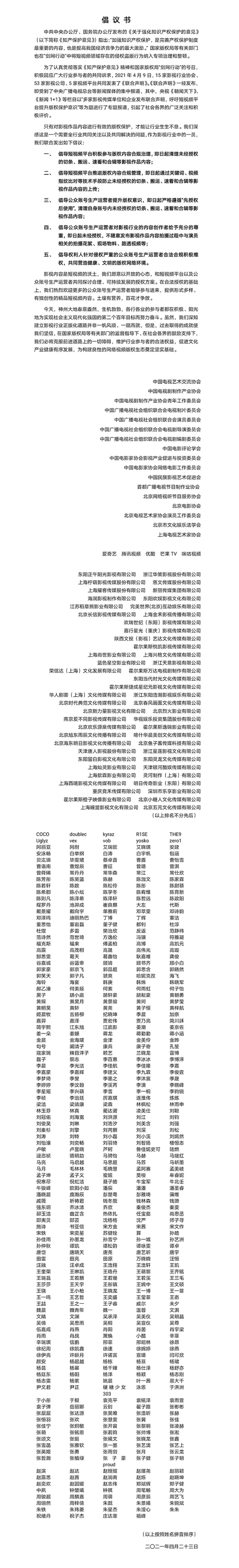 倡议书里说道:“我们愿意以开放的心态,和短视频平台以及公众账号生产运营者共同探讨合理、可持续发展的授权方案。”
