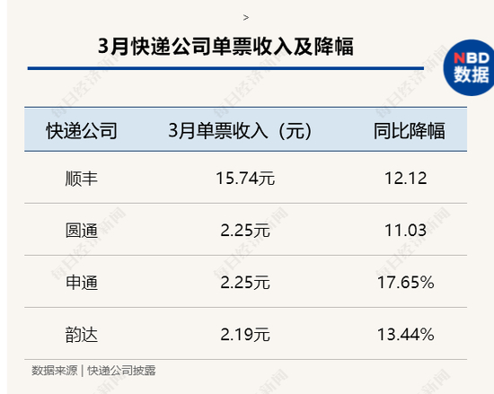 快递公司最新披露的3月快递服务业务经营数据显示:顺丰、圆通、申通、韵达的快递业务单票收入分别为15.74元、2.25元、2.25元、2.19元,同比降幅分别达到12.12%、11.03%、17.65%、13.44%。