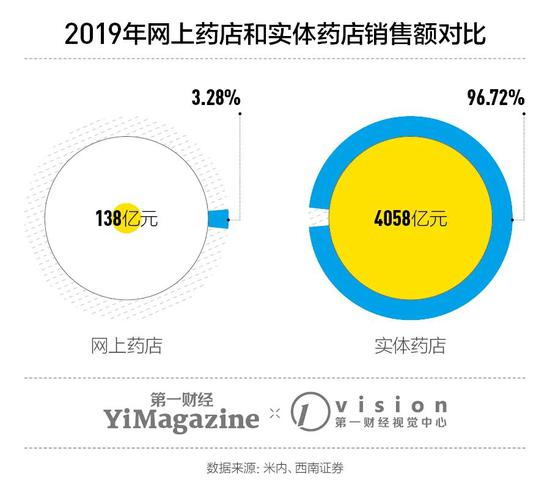 在网络药店和实体药店之间,现阶段前者还远未形成对后者的冲击。2019年,中国实体零售药店的年销售额为4058亿元,互联网渠道的交易规模只有138亿元,在整个医药零售市场中占比仅为3.28%。
