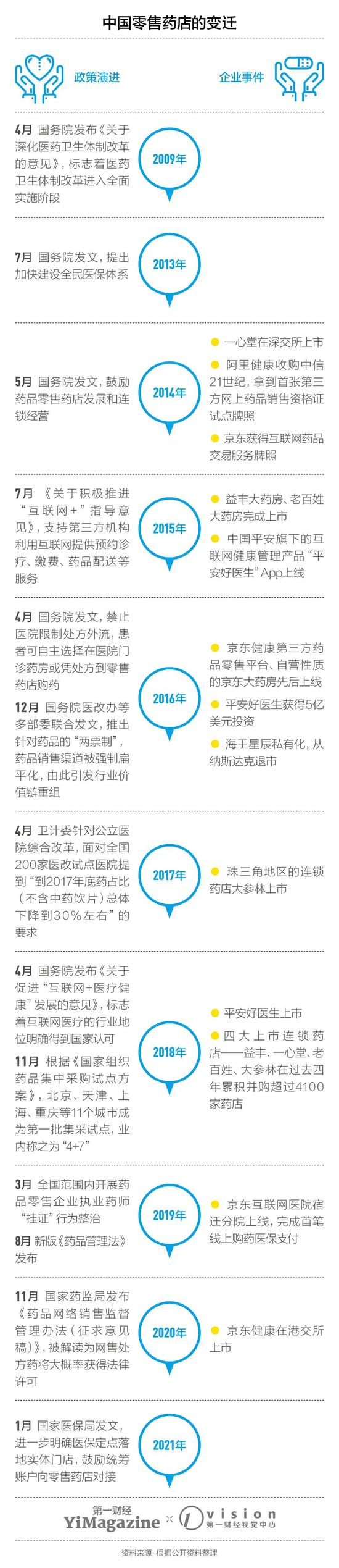 自2009年开启的新一轮医改,彼时正在从多个角度迫使公立医院落地“医药分家”。新医改动刀的对象非常明确——在不透明的医院药品市场,院内的药品往往价格扭曲,多个中间环节共同推高药价、助长商业腐败,令患者和医保基金利益长期受损。围绕药品零售改革所做的政策调整,总体上是在做两方面的努力:推动公立医院供给侧改革,同时扶持院外医药零售体系更加完善,以承接医院端导入的药品销售需求。