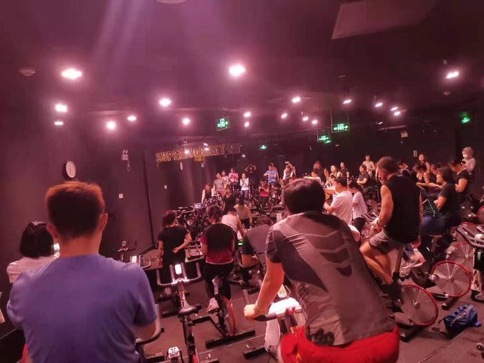 健身热潮的身影,在这一地带商场内并不难寻。向西几百米,金地广场商场即有超级猩猩,动感单车房里播放的音乐作响,伴随着教练喊出的口号,二十几个会员同时锻炼。