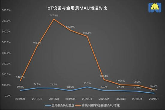 但我们来仔细拆解下这组数据,就会发现形势并不乐观。上述1.46亿里,9770万月活来自第三方应用,剩下的4830万才是物联网和车载设备月活用户,也就是说,截至2021Q1,MAU的“含loT率”为19%。而且近两年,IoT设备的MAU增速呈减缓趋势。