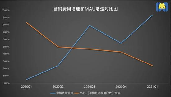 另一个明显的变化是,2020年初,受益于疫情期间“宅经济”的刺激,喜马拉雅的MAU增速高达83%,可一旦疫情得到控制、利好因子消失,活跃用户增速一路向下。2021Q1,喜马拉雅在上市前一系列烧钱活动,依然没有换来更多的用户关注度。