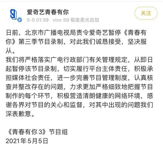 今天(5月5日)凌晨,@爱奇艺青春有你 发文,表示对北京市广播电视局责令停播通知,诚恳接受,坚决服从。即日起暂停该节目录制,认真核查并整改存在的问题。