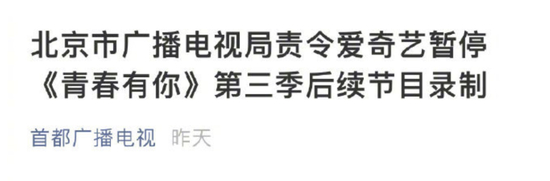 根据网络视听节目相关管理规定,北京市广播电视局现责令爱奇艺暂停《青春有你》第三季节目录制。