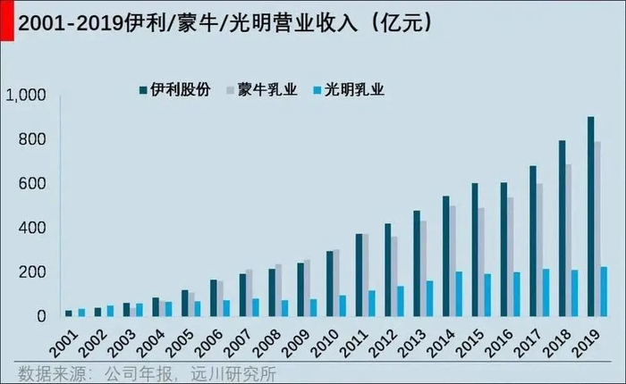 1996年,上海以“光明牌”为基础,组建了光明乳业,凭借上海及华东市场的购买力,光明的高价低温奶销路大开。到2002年光明上市时,其主营收入高达50.21亿元,远超伊利的40亿元和蒙牛的16.68亿元,其牛奶在国内的产销量、收入及市占率均是第一。