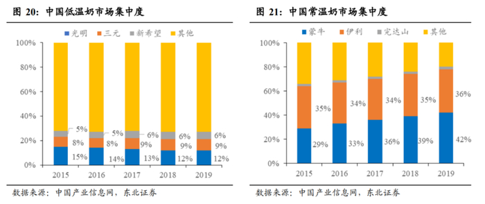 监管之下,产业链上游的个体奶农、小型奶厂逐渐偃旗息鼓,下游渠道能力更强的龙头公司快速抢占市场。凭借常温奶在价格和保质期上的优势,蒙牛和伊利用农村包围城市路线瓜分了近80%的常温奶份额。