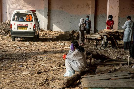 周三(4月28日),新德里加齐布尔火葬场的送葬者和工作人员在停车场内举行仪式。
