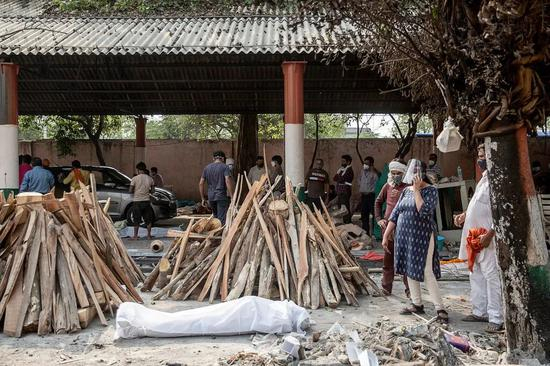 印度,新德里。首批36具尸体被放置在指定的混凝土火化坑中,并在上午10点前点燃。之后,所有多余的尸体都被送到了泥泞的停车场,以便稍后举行集体仪式。