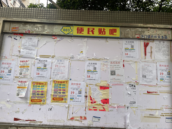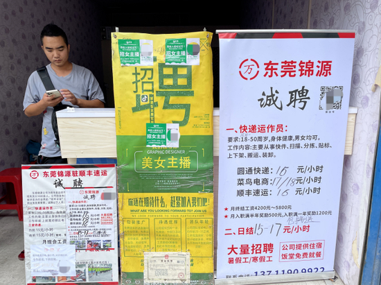 东莞街头随处可见招聘信息,工时费普遍在15元到19元每小时。摄影:张楠茜