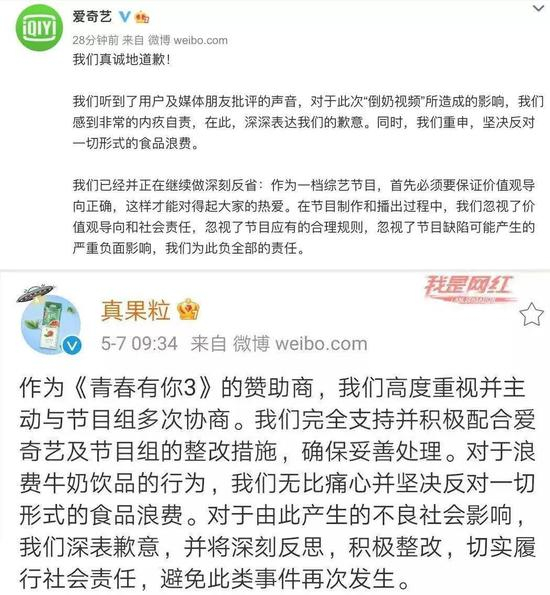 近期,北京市广播电视局发文,责令爱奇艺暂停网络综艺选秀节目《青春有你3》的后续节目录制,原因是群众举报该档节目存在相关问题。此前,这档节目被曝出以“购奶投票”为名,引诱粉丝购买节目赞助商牛奶,粉丝投票之后倒掉牛奶,造成大量浪费。目前,《青春有你3》出品方爱奇艺、节目冠名赞助的蒙牛皆通过官方微博对“倒奶事件”发布了致歉声明。