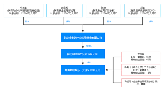 从哇唧唧哇的股权结构来看,林芝利创信息技术有限公司(下称“林芝利创”)占股16%,而“林芝利创”背后为深圳市利通产业投资基金有限公司(下称“利通产业”)全资控股,而利通产业背后各占25%股权的实际出资人皆为腾讯系高管。