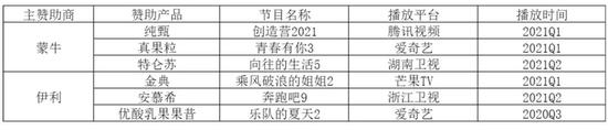2020年,蒙牛的广告及宣传费用为68.03亿元,占收入比重为8.9%;伊利广告营销费为109.99亿元,占收入比重为11%。这意味着,一年365天,蒙牛每天有1800多万元的广告宣传支出,而伊利则达到每天3000多万元。综艺节目成为两家乳企的“必争之地”,仅在去年和今年它们就赞助多档热门综艺。
