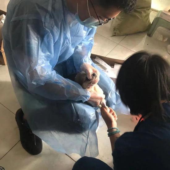 志愿者们赶紧采取紧急措施。他们买了针管和葡萄糖水,通过宠物箱筐上的小洞喂给小动物,希望能让它们坚持下来。后来来了更多志愿者,几十个人忙到天亮。