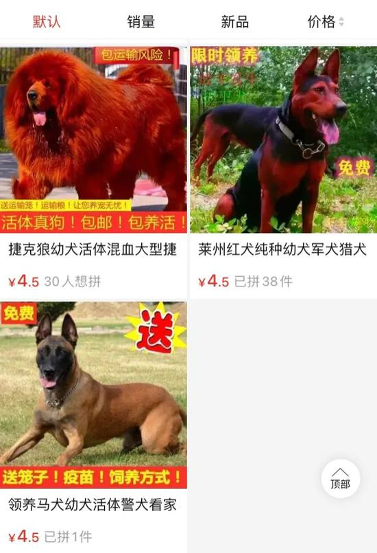拼多多上搜索宠物盲盒,跳转页面呈现出超低价拼单宠物,拼单量还在上涨