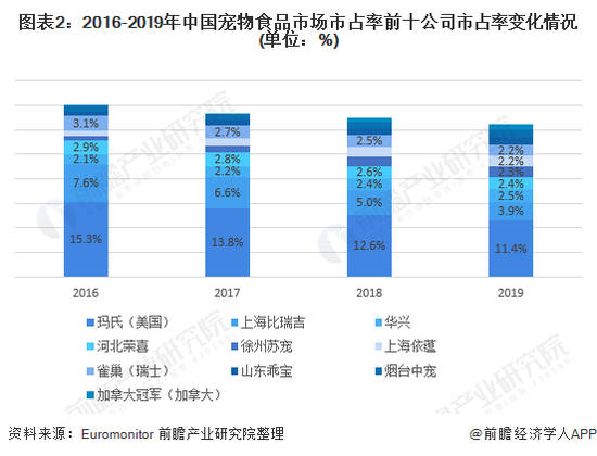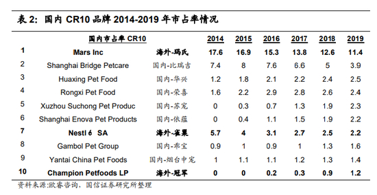 但是,千亿级别的中国宠物食品市场,头部却都是外国品牌——国信证券的数据显示,2019年宠物食品品牌市场份额最高的公司是美国的玛氏(MARS),整体市占率为11.4%,而位列第二的国内公司比瑞吉只有3.9%[7]。