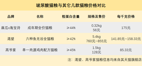 这意味着,这袋售价56元、含量320克的猫粮里,其中玻尿酸成本仅约0.416元,但这个噱头可以直接让其价格飞上枝头。