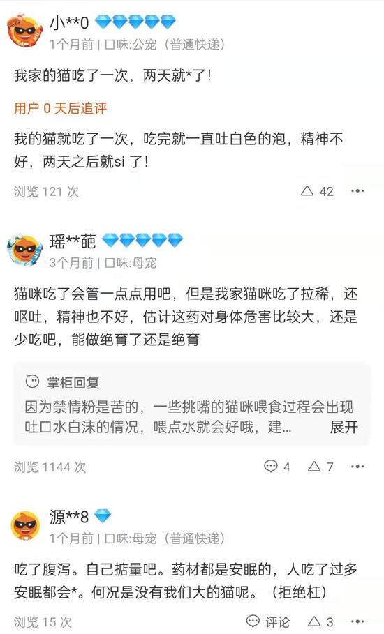 而还有一种自称能抑制母猫发情的禁情粉,会导致宠物激素紊乱,甚至肾衰竭而死。淘宝一款月销量5000+的禁情粉评价中,已有不少因使用禁情粉致宠物死亡的案例。