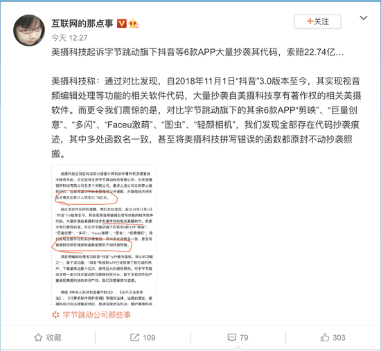 5月10日,有自媒体@互联网的那点事 在微博曝光美摄科技起诉字节跳动旗下抖音等6款APP大量抄袭其代码,索赔22.74亿。
