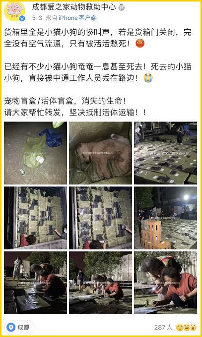 一条沾满了鲜血的宠物产业链,由此形成。猫狗贩们与快递公司勾结,前有做的光鲜亮丽的假图广告,后有狗场快递公司一条龙,趁着深夜,在完全违反活体运输的基本法律前提下,一车车奶猫奶狗被强行装进“盲盒”,发往“新家”,送到搓手等待开盒抽奖的“主人们”手中。