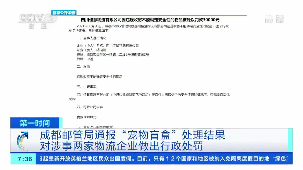 [第一时间]成都邮管局通报“宠物盲盒”处理结果 对涉事两家物流企业做出行政处罚