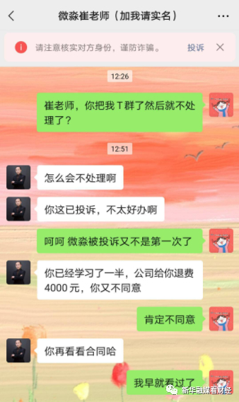 结果,学员们的质疑引来上课老师的警告:再在群里带节奏,把你踢出群。