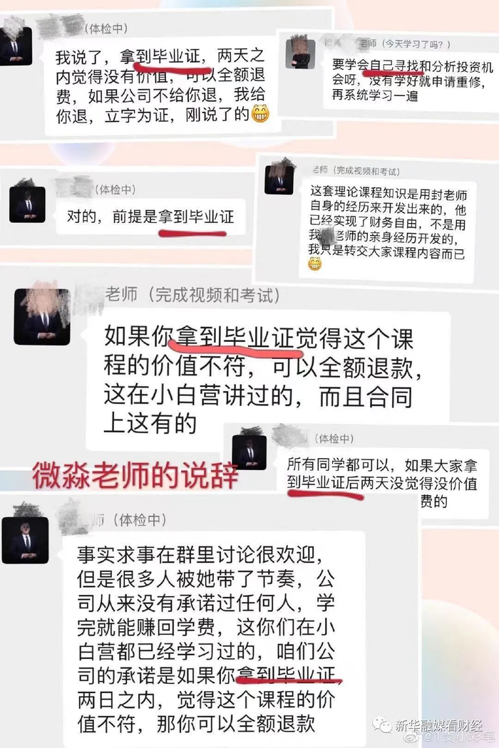 记者在微淼理财课的学习群里,当初老师们信誓旦旦表示不满意可以退款的说辞,变成了另一套:退款的前提是拿到毕业证。“拿到毕业证后,觉得课程价值不符,可以全额退款,而且合同上是有的。”