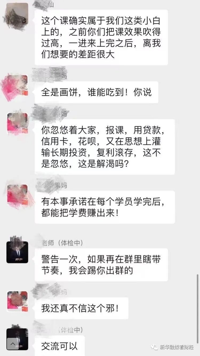 有学员在群里抱怨称:“忽悠大家报课、用贷款、信用卡、花呗,现在又灌输长期投资、复利等,这不是忽悠吗?有本事承诺把学费赚回来。”