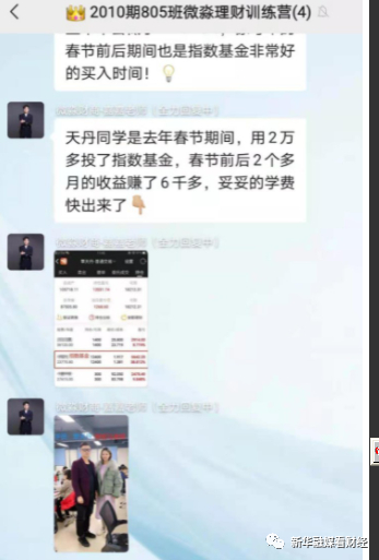 在学习几天后,老师会不断灌输所谓的富人思维,“你不理财、财不理你”的思想,同时宣传进阶学员的收益对比图,进一步便是引导学员报名6998的进阶课程。