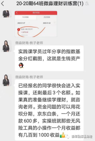 在一个微淼小白群,老师会贴出实践课学员投资指数基金的收益,“一个月收益上千”、“两个月赚6千多”等宣传,老师还说没有学费可以向花呗分期、京东白条等借钱。