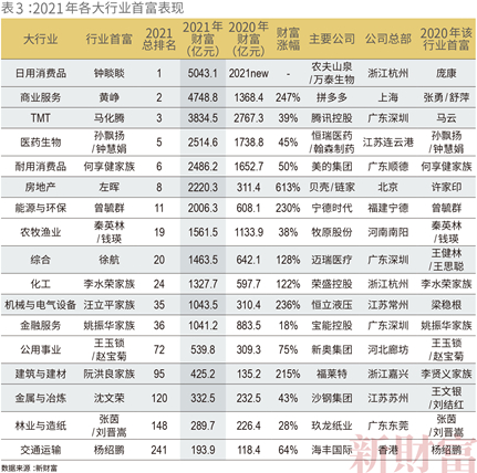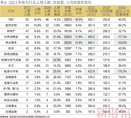 观察行业首富的财富值及其名次,行内上榜人的数量与人均财富增速等指标,可以清晰感知,一个行业的创富势能。
