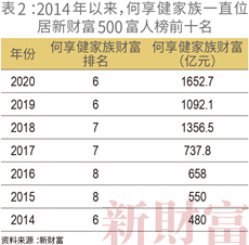 何享健家族则是榜单常青树的典型代表。2003年以来,何享健家族一直榜上有名,2014-2021年间,更是稳居榜单前十(表2)。