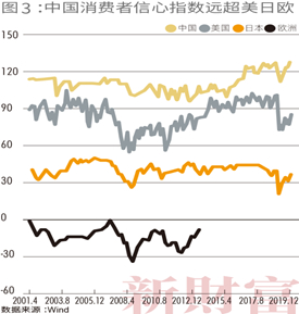 中国中等收入群体稳定扩容,消费者信心指数远超其他发达经济体,消费、商业服务业等还将有长期稳定的上扬表现(图3)。