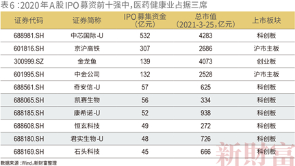 在A股2020年IPO募资额前十强中,除了中芯国际、京沪高铁、金龙鱼、中金公司这样的头部明星公司,医药生物公司贡献了3名,为最强行业。其中,君实生物熊俊以百亿身家,跻身新一届富人榜(表6)。