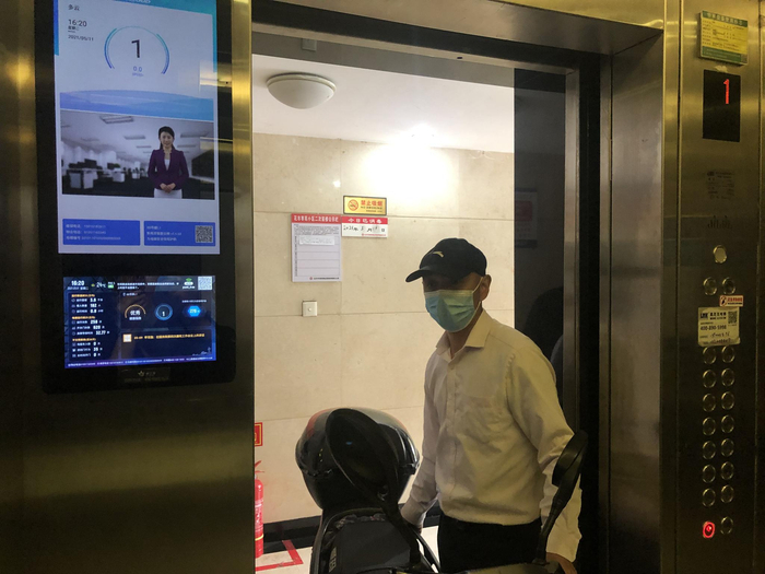 推着电动车试验的物业工作人员告诉新京报记者,“这就是我们已经用了一年半的防控系统”,他指了指电梯轿厢左上角的一个摄像头说,“一旦有居民推进来电动车,它能够通过图像识别判定,电梯里的大屏幕就会滚动播放提示语,电梯门也关不上,同一时间,电动车进入电梯的信息会传到我们管理人员的手机上。如果有住户僵持着不退出,我们会上门干涉。”