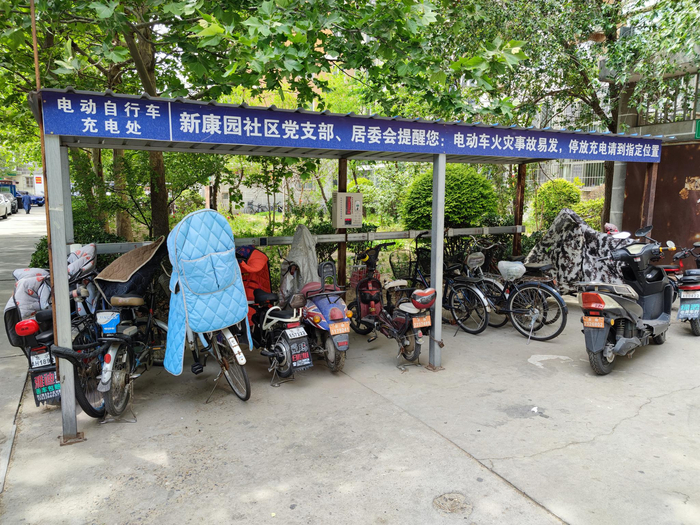 5月11日中午,新京报记者来到昌平区新康园小区。在北区三期院内,几乎每栋居民楼前都有电动车充电棚,上面写着“电动自行车充电处,新康园社区党支部、居委会提醒您:电动车火灾事故易发,停放充电请到指定位置。”