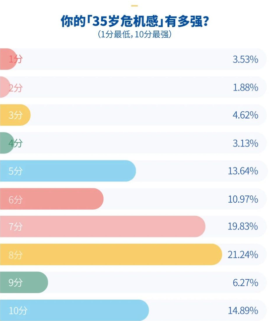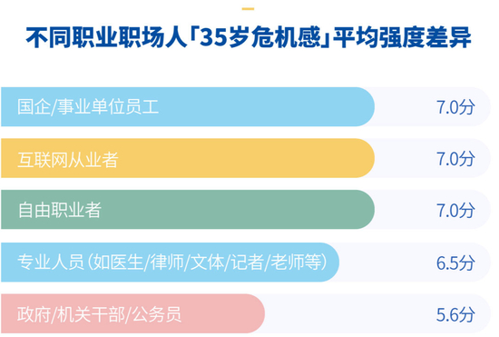 在我们的调查中,国企/事业单位员工、互联网从业者、自由职业者的‘35岁危机感’最大,平均值达到7分。可见在快速发展的社会里,不管在什么行业,都没有‘完全稳定’的工作。