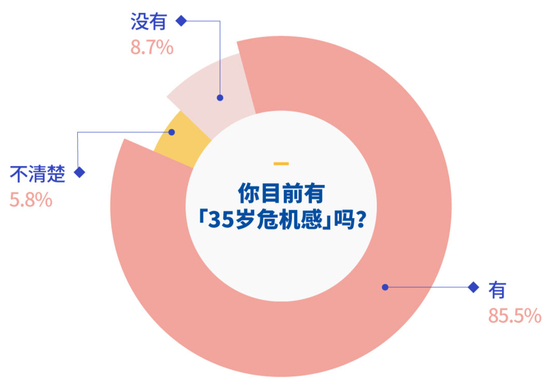 面对35岁这一‘人生分水岭’,这届职场人依旧非常焦虑。调查显示,85.5%的受访者表示有‘35岁危机感’,仅有8.7%的受访者没有。
