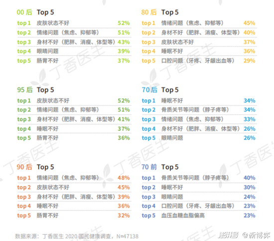 CBNData发布的《年轻人养生消费趋势报告》显示,我国半数以上的“90后”有脱发、掉发、视力减弱的困扰,同时约有四成存在肥胖、运动能力下降的情况,还有三成出现免疫力下降的问题。根据丁香医生《2020国民健康洞察报告》,目前皮肤状态不好、情绪问题、身材不好、肠胃不好、睡眠不好是困扰Z世代的五大健康问题。