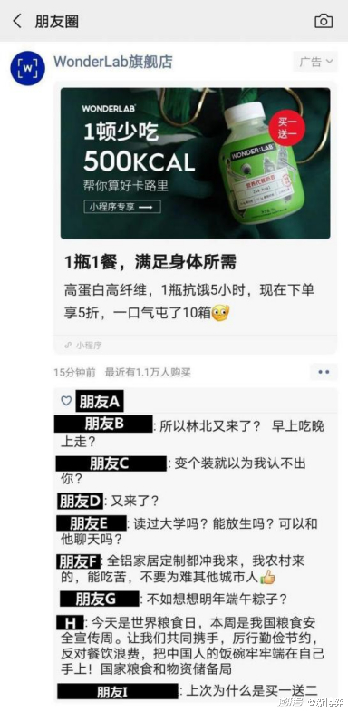 近年,代餐概念炙手可热,但有不少健身博主表示代餐粉提供的饱腹感微乎其微,营养成分含量远低于中国营养学会建议的每餐摄入量,大部分的代餐奶昔低蛋白、高碳水,完全违背了高蛋白、低碳水的减脂理念,更出现有消费者吃出肝功能衰竭的情况。在2020年年底,当wonderlab的广告出现在朋友圈时,评论区一片冷嘲热讽。