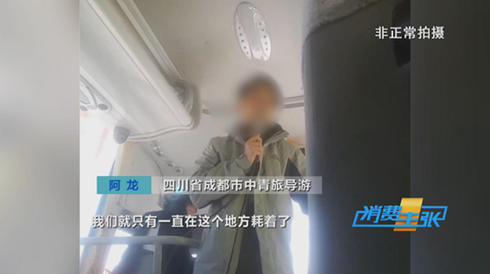“我们政府是以这样优惠的团费,把大家请到这里来,你们的团费有多低,阿龙压力就有多大。但是,刚才我们这两站下来之后,我们车上的朋友,你们花了多少钱?我们在这边所享受到这样一个待遇、服务,是不(能)平等的,我们在这边吃了当地的,玩了当地的,住了当地的,我们摸着自己的良心,想一想我们来到这边,我们花了什么钱,朋友们。”