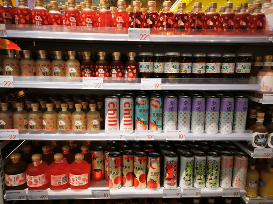 据‘创业最前线’了解,近两年,市场上出现多个低度酒品牌,比如贝瑞甜心、马力吨吨、走岂清酿等。我们在北京市朝阳区一家KKV门店看到,店内陈列的低度酒品牌大约有30个,价格大多在几十元。